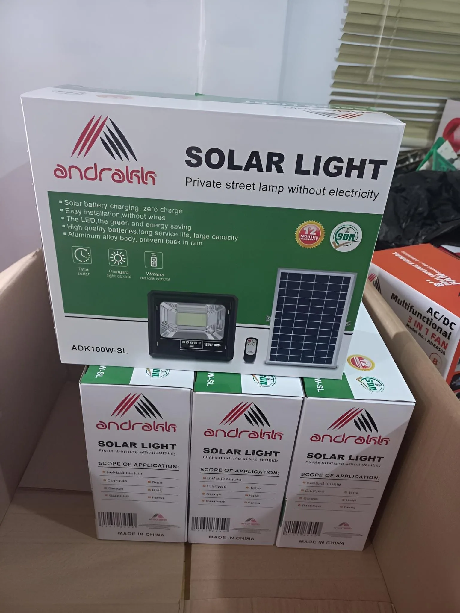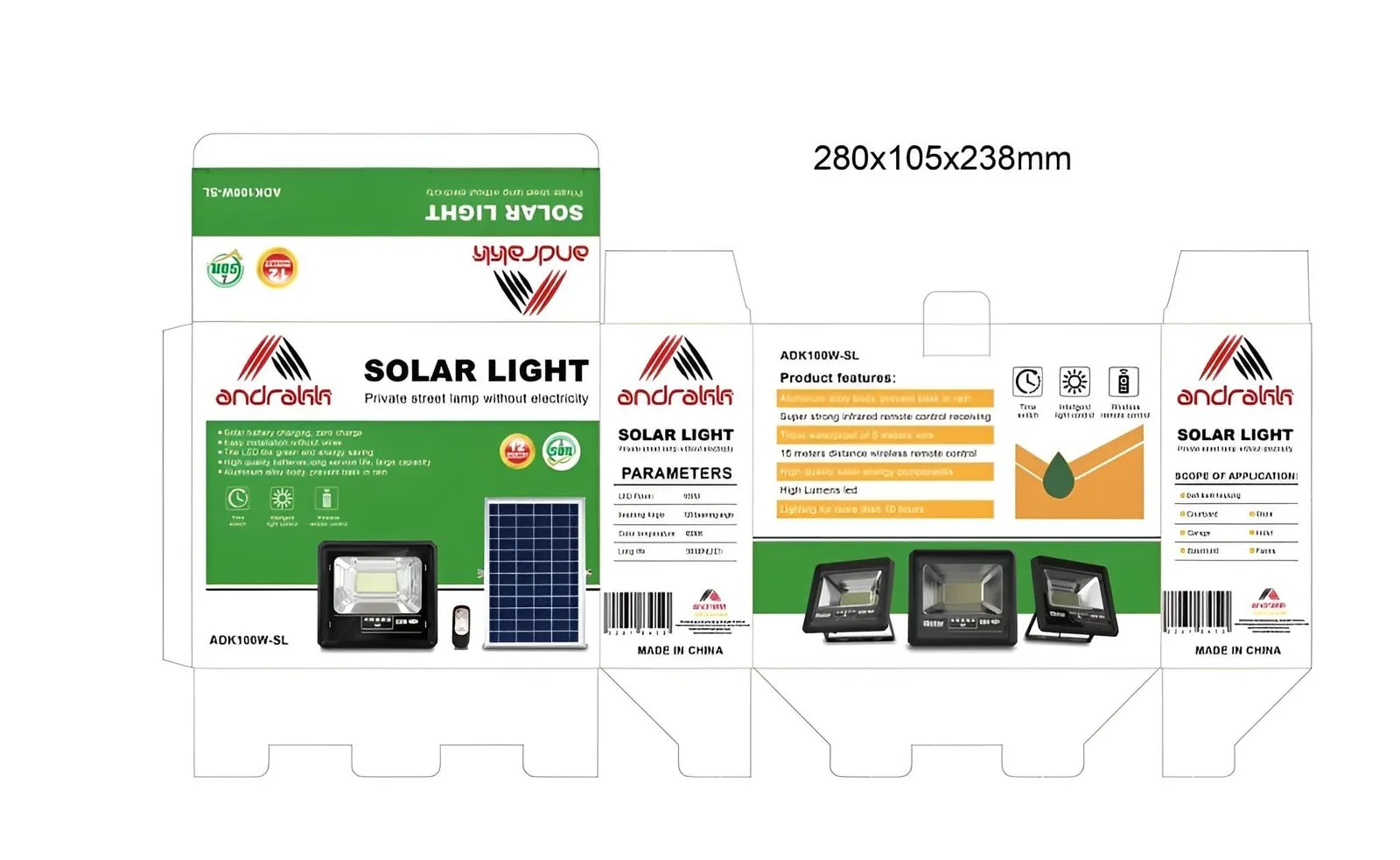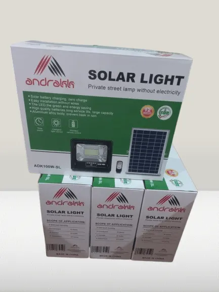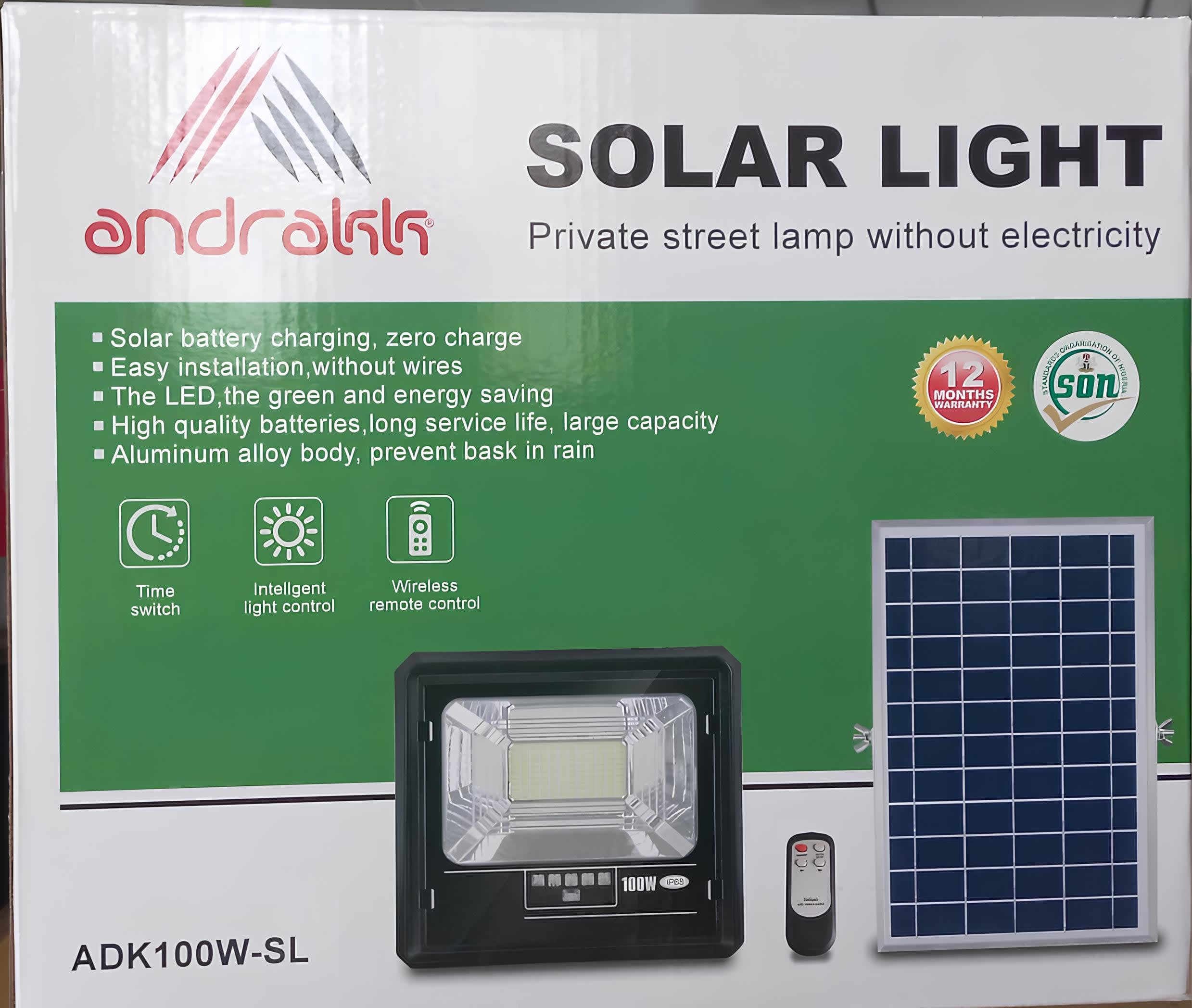 The Andrakk ADK100W-SL Solar Light is a reliable and energy-efficient solution for outdoor lighting, designed to function without electricity. It features solar battery charging, eliminating the need for external power sources and reducing electricity costs. With high-quality batteries, this solar light ensures a long service life and large capacity, providing consistent illumination throughout the night. Its intelligent light control automatically adjusts brightness based on surrounding conditions, making it both convenient and energy-saving.