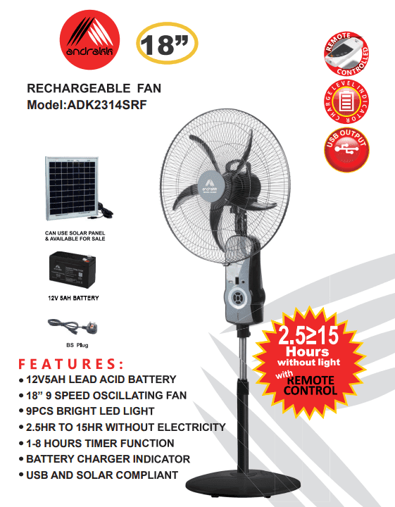 ADK2314SRF—Andrakk 18" Rechargeable Fan