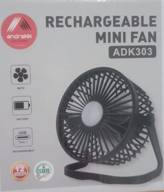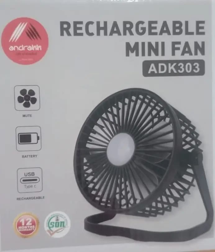 This mini fan is well-suited for use on desks, bedside tables, and small spaces where larger fans may not be practical. Its rechargeable function ensures it remains useful during power outages, while its lightweight build makes it easy to carry for outdoor relaxation or commuting. Quiet and efficient, the Andrakk Mini Fan — ADK303 is a practical cooling solution for everyday use.