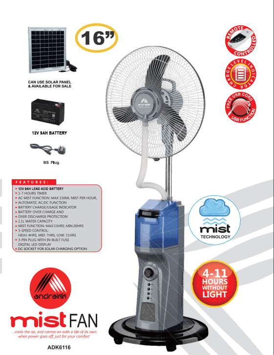 For added convenience, this rechargeable mist fan is compatible with the Andrakk Solar Panel (ADK 18V 20W), allowing you to stay cool without relying on electricity or generators. For optimal performance, it is recommended to connect and charge the battery for at least 10 hours. To maximize battery lifespan, the mist function operates only on AC power. The Mist Fan provides reliable cooling and energy efficiency, making it an essential appliance for any environment.