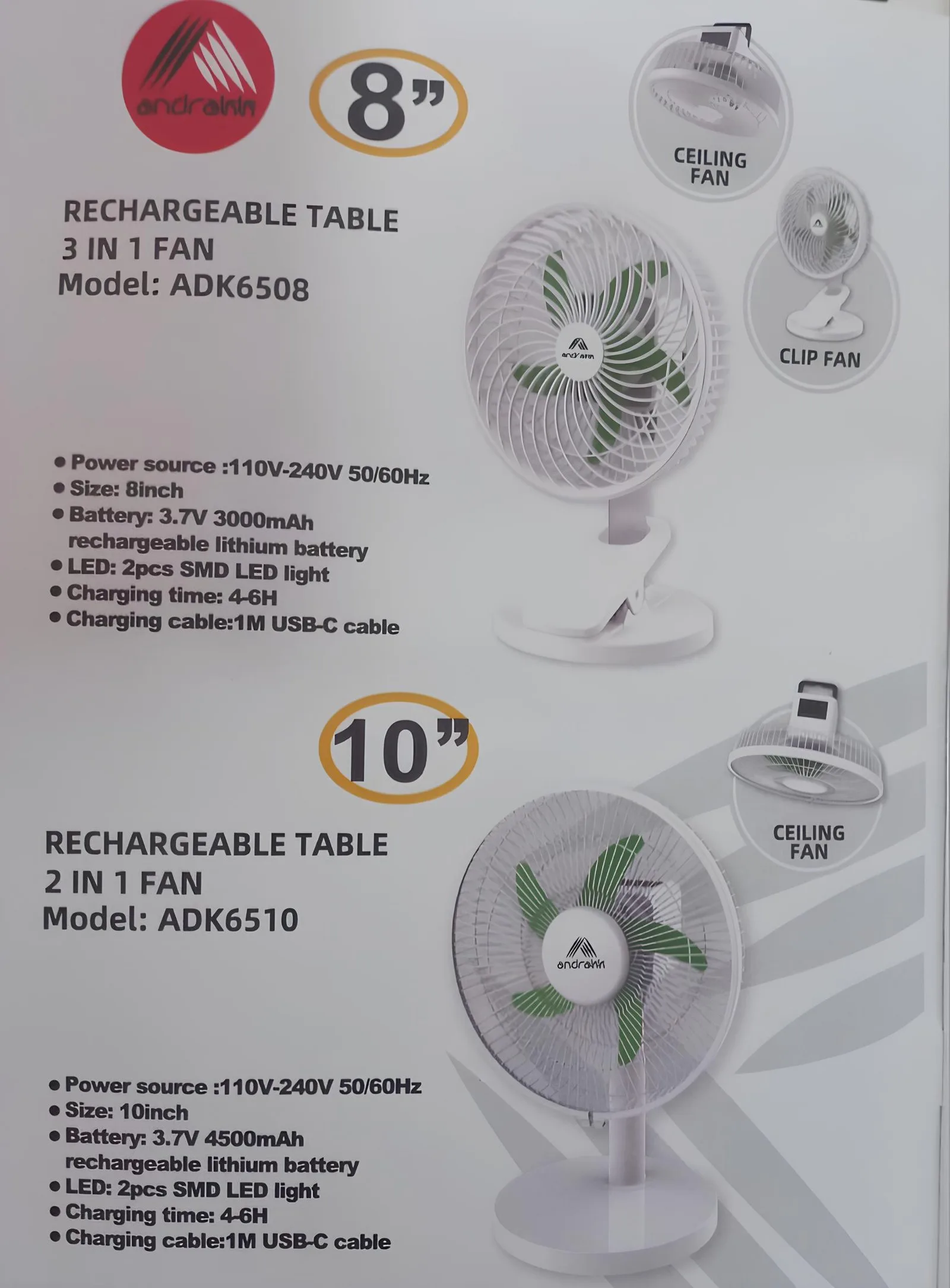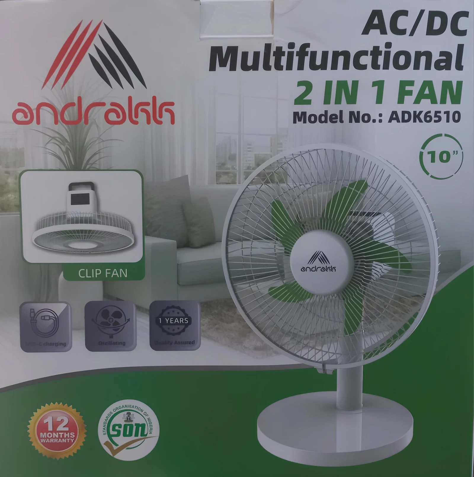 Stay cool anywhere with the Andrakk ADK6510 Multifunctional 2 in 1 Rechargeable Table Fan. It features a 4500mAh rechargeable lithium battery and supports USB-C and solar panel charging, ensuring uninterrupted airflow even during power outages.