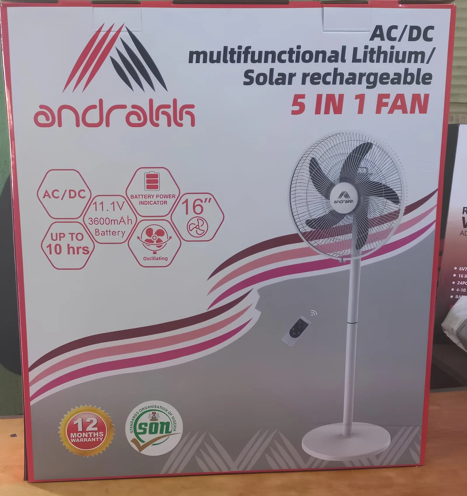 The ADK6516 Andrakk Rechargeable Fan is designed to keep your home or office cool and comfortable. Equipped with powerful 16-inch blades, the ADK6516 delivers refreshing airflow, while its adjustable tilting head allows you to direct the breeze exactly where you need it. With multiple speed settings, you can customize the airflow to your preference.