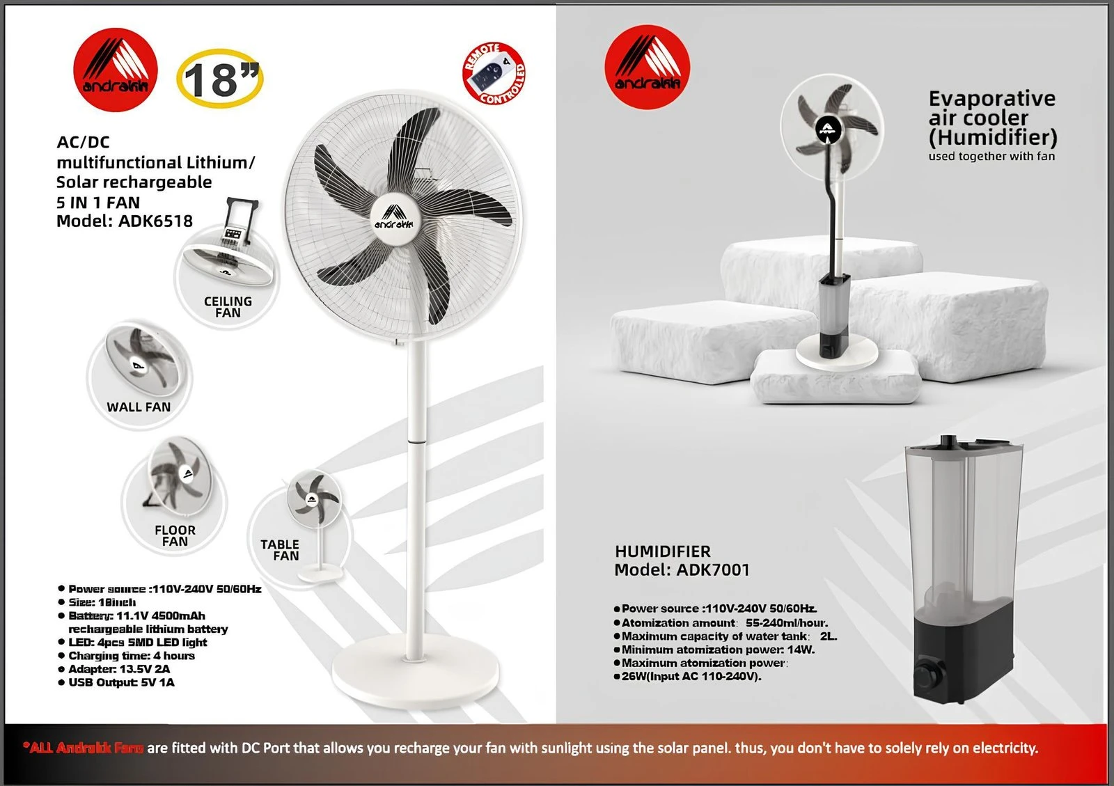 This ADK6516 can be used in various ways, functioning as a ceiling fan, floor fan, table fan, or wall fan to suit your space and needs. In addition, it is solar compatible and can be equipped with a humidifier, enhancing air quality by adding moisture to the air—perfect for dry environments.