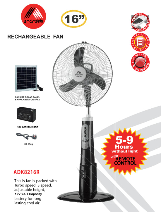Featuring a built-in LED night light, this fan provides both cooling and illumination during power outages. Its high-efficiency 16 inch blades deliver strong, refreshing airflow with three adjustable speed settings—high, medium, and low—allowing you to pick which is best for your comfort. The fan operates quietly, making it perfect for use while sleeping or working. Whether indoors or outdoors, the ADK8216R is a reliable and energy-efficient cooling solution, as it can be equipped with the Andrakk Solar Panel (ADK 18V 20W) making it ideal for areas with inconsistent power supply.